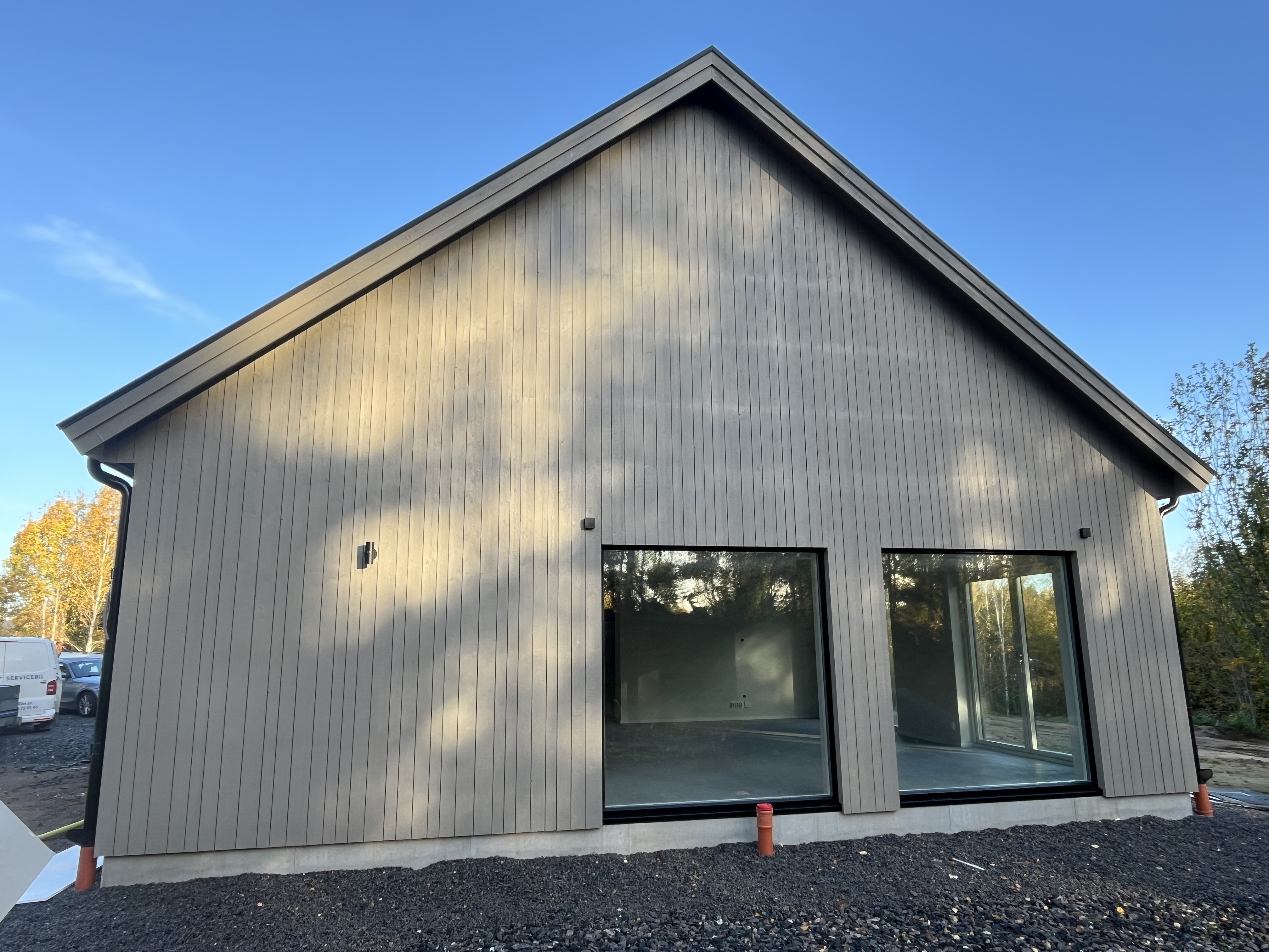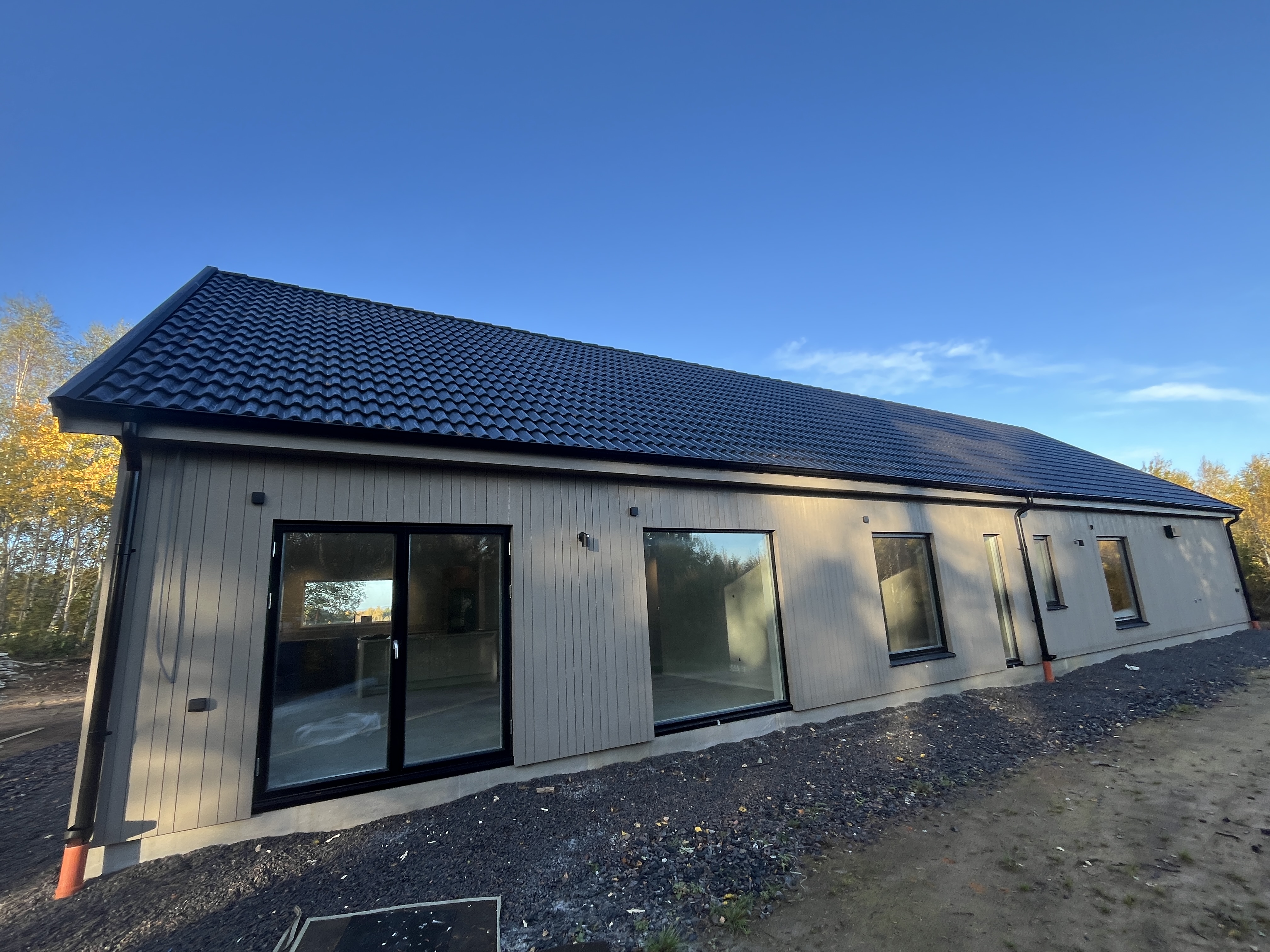 Detta moderna enplanshus på 134,7 m² erbjuder en ljus och öppen planlösning med ett stort kök och vardagsrum på 50,5 m² och ryggåstak som skapar extra rymd. Stora fönsterpartier ger generöst ljusinsläpp och möjlighet till framtida glasveranda.