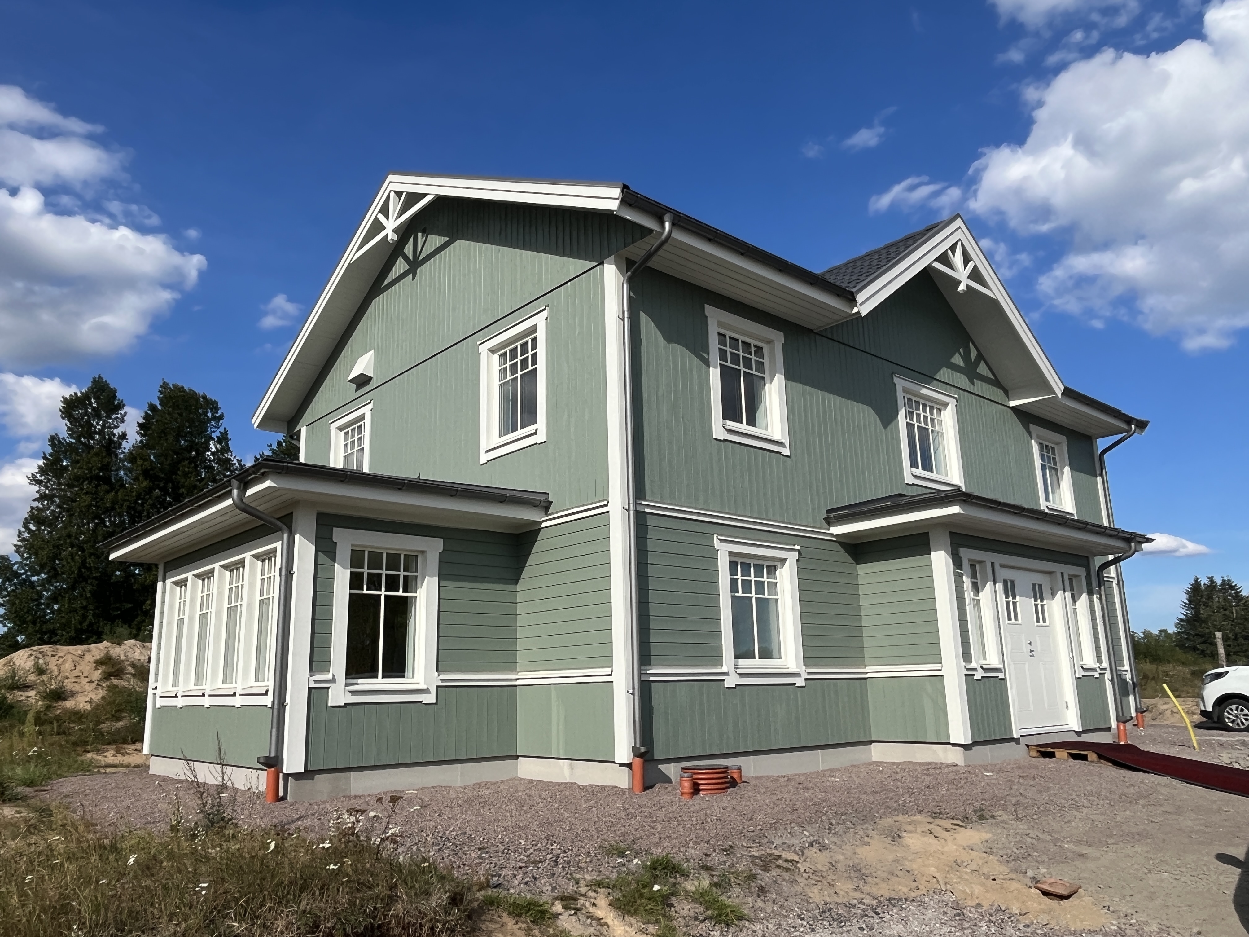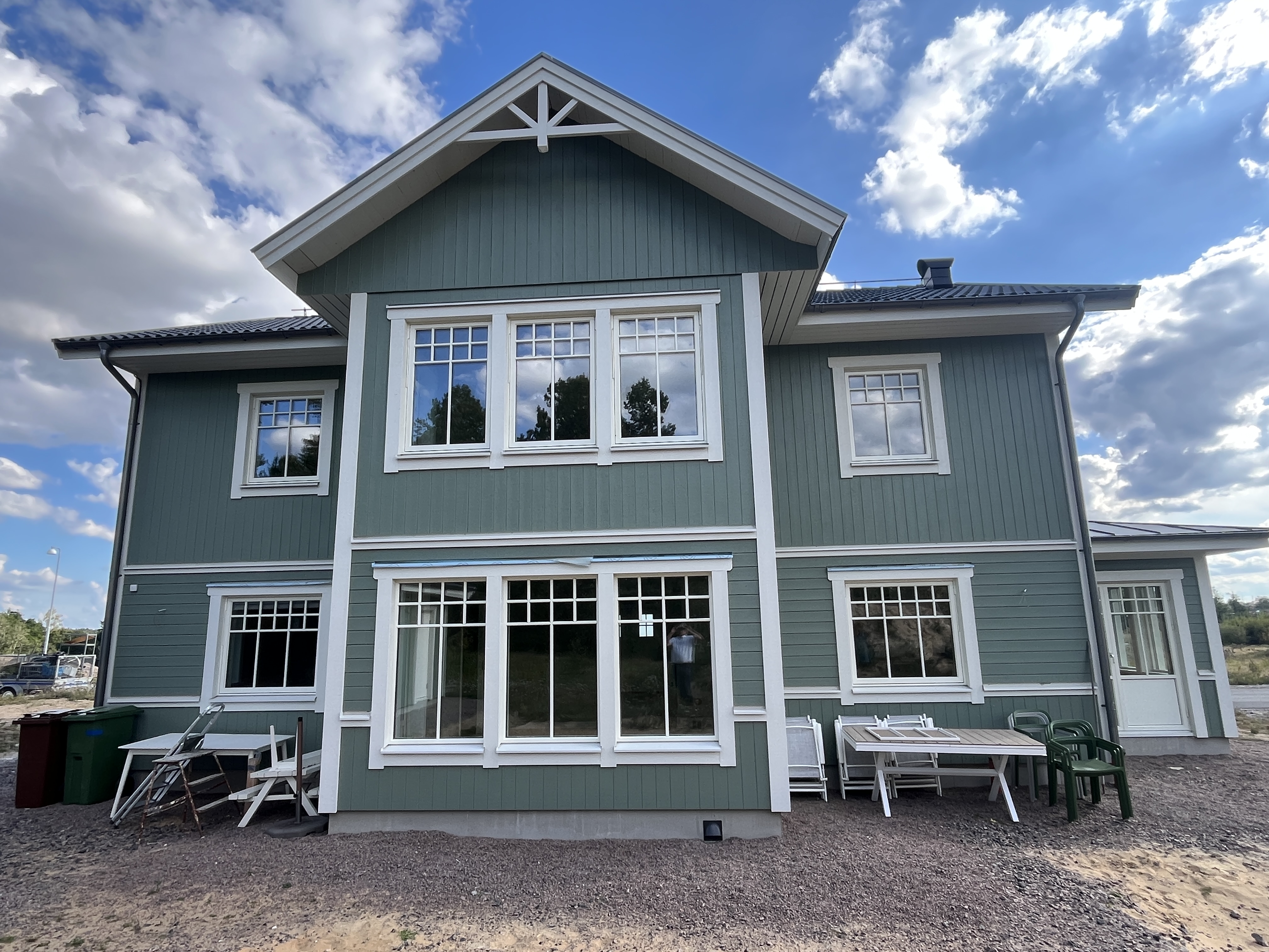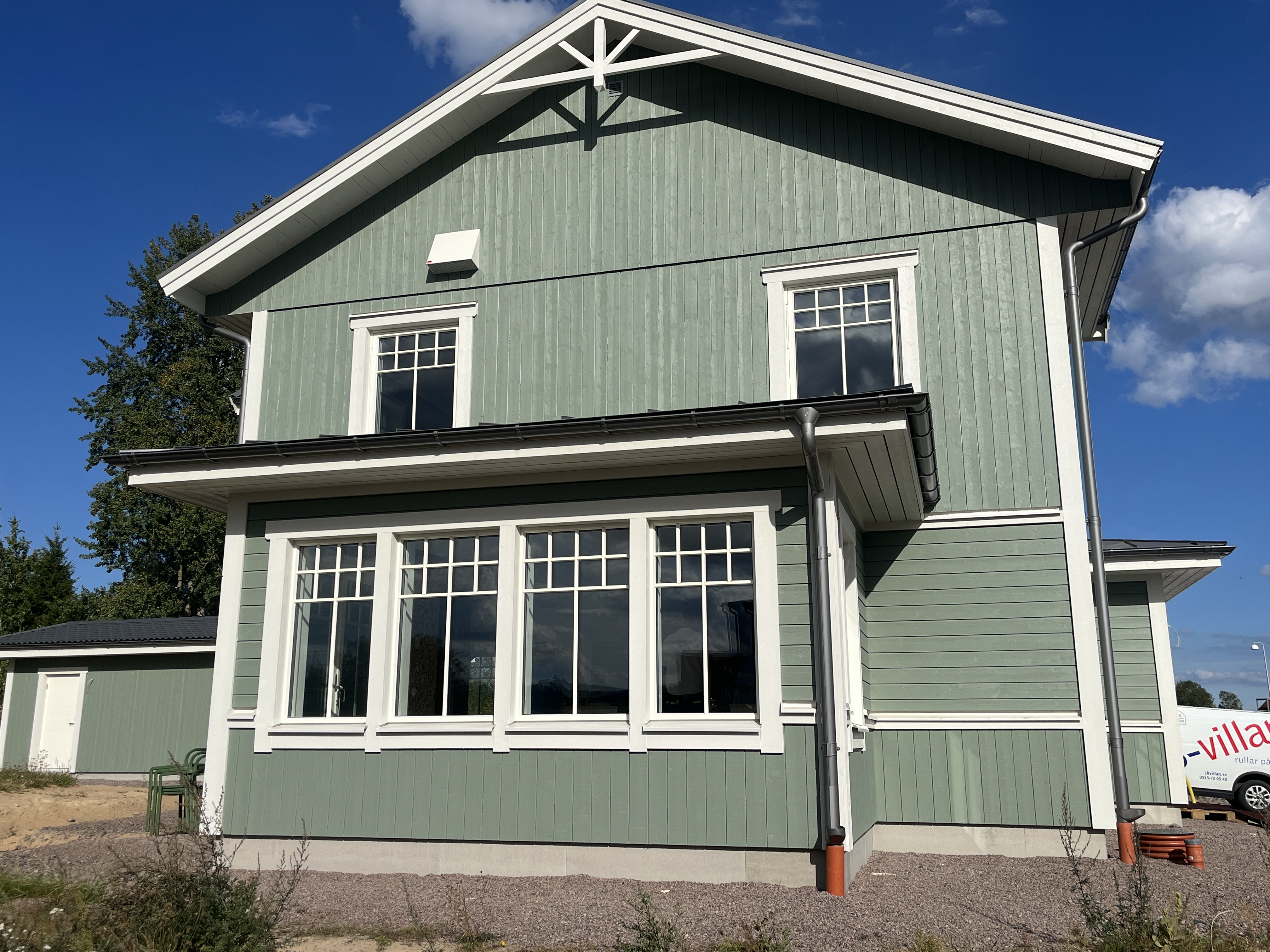 Den ljusgröna fasaden med de vita detaljerna ger en klassisk, tidlös känsla!
