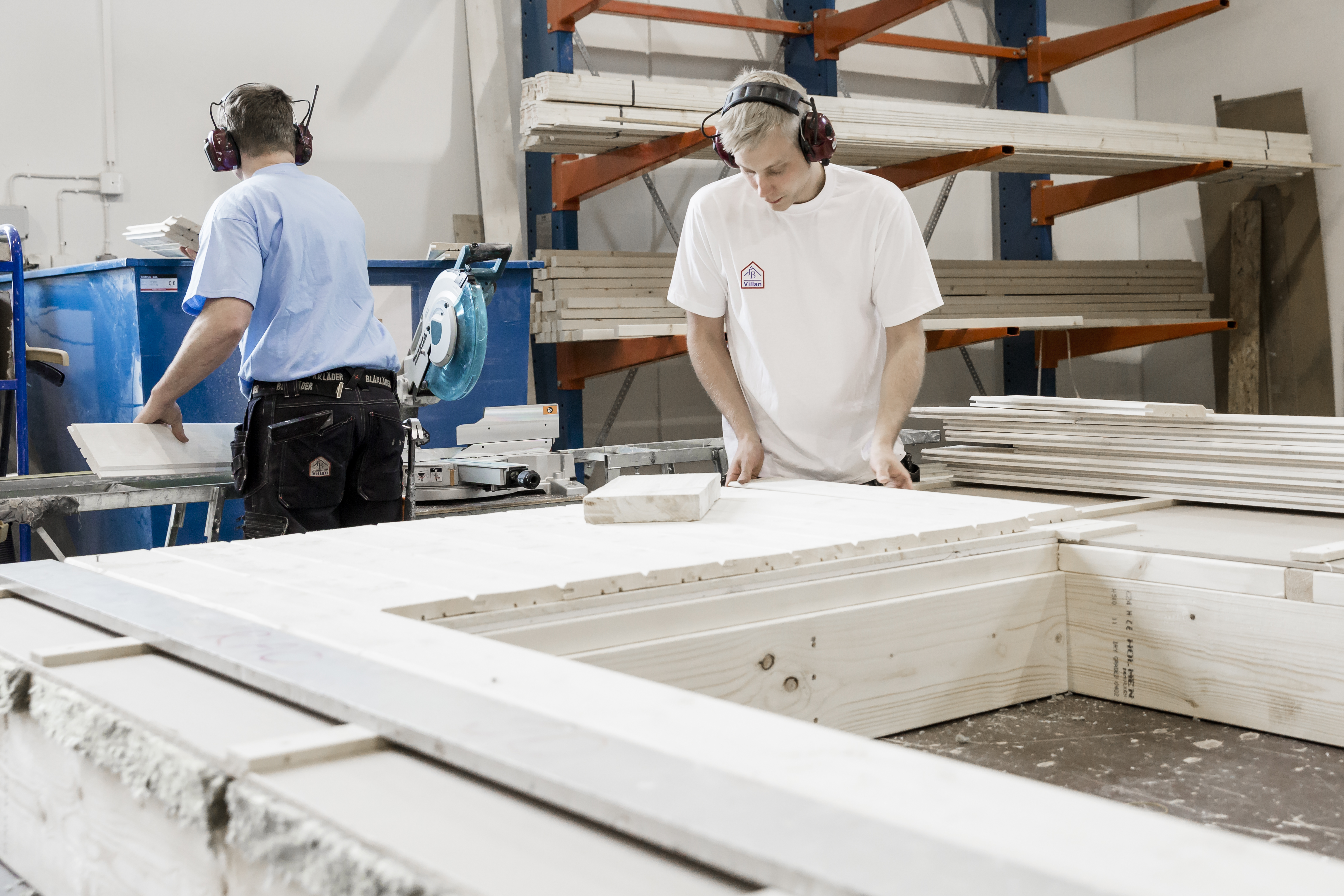 I vår fabrik i Gudhem tillverkar vi alla väggblock och gavelspetsar inomhus i torra fina lokaler. Våra skickliga hantverkare kontrollerar att väggblocken passar perfekt ihop när vi skall montera huset. Vår produktion är flexibel och ligger i direkt anslutning till vårt kontor. Det betyder att vi direkt kan anpassa oss oss och ställa om produktionen efter våra kunders önskemål.